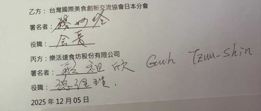 2025年12月5日、当会は台湾食品業界のイベントに招待され、多くの来賓の立ち会いのもと、「楽活速食坊」と覚書(MOU)を正式に締結いたしました。両者は今回の協業を通じて、台日間の食品産業交流を一層強化し、さらなるビジネスチャンスの創出を目指します。